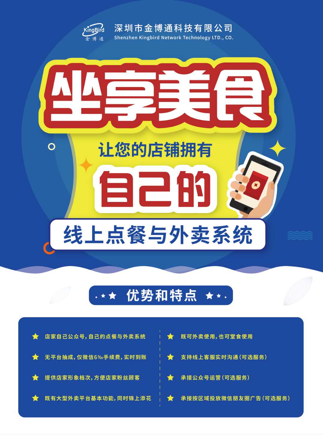 為什么建議你找金博通呢?金博通創(chuàng)建的線上點(diǎn)餐與外賣系統(tǒng),擁有著獨(dú)一無二的優(yōu)勢。利用店家自己的公眾號(hào),幫助店家建立自己的點(diǎn)餐與外賣系統(tǒng),且該系統(tǒng)既有大型外賣平臺(tái)的基本功能,還能錦上添花。它不僅可以外賣使用,也可以堂食使用,還支持線上客服實(shí)時(shí)溝通。重要的是,店家擁有自己的線上點(diǎn)餐與外賣系統(tǒng)之后,免去了平臺(tái)抽成,只有微信6‰手續(xù)費(fèi),實(shí)時(shí)到賬。此外,為了方便店家留住粉絲和吸引顧客,金博通還提供店家形象檔次服務(wù)以及承接公眾號(hào)運(yùn)營、按區(qū)域投放微信朋友圈廣告。