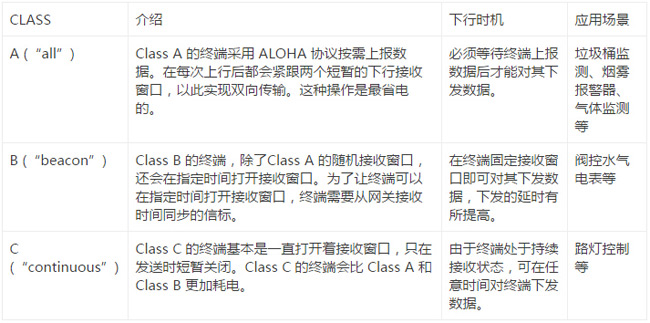 在開頭的介紹中我們就看到有協(xié)議中有規(guī)定 Class A/B/C 三類終端設(shè)備,這三類設(shè)備基本覆蓋了物聯(lián)網(wǎng)所有的應(yīng)用場(chǎng)景。為了方便大家,做了一個(gè)表。